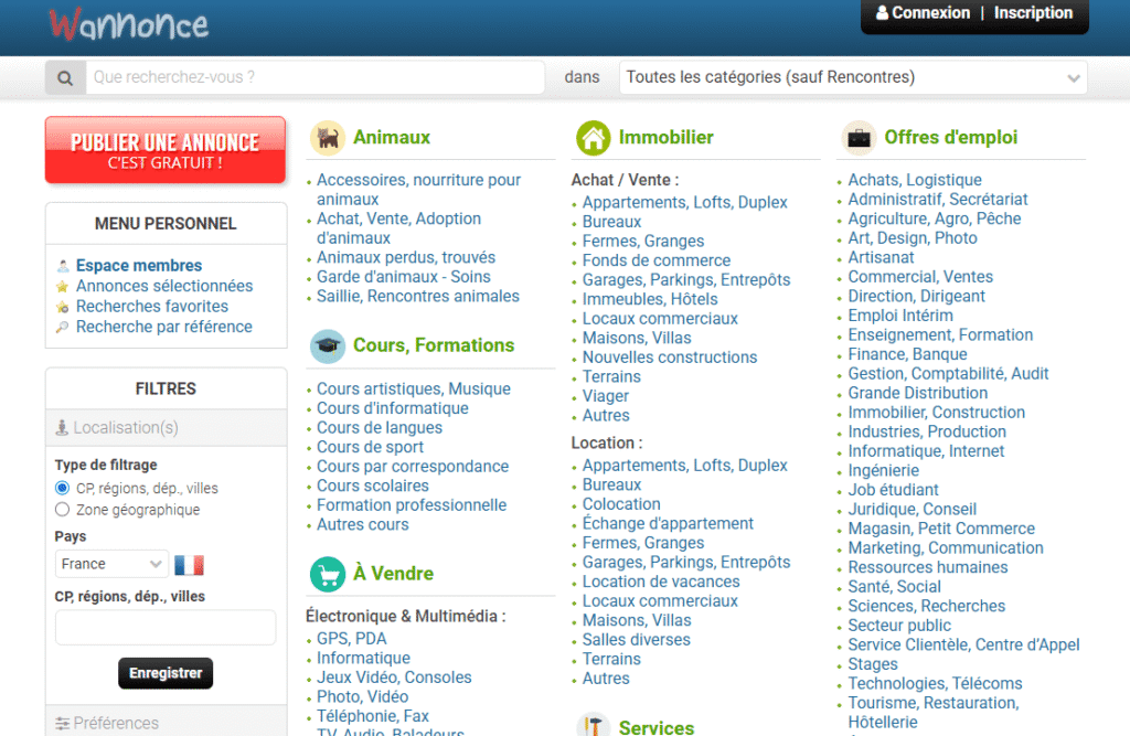 Wannonce couvre un large éventail de besoins. Vous y trouvez des annonces immobilières pour acheter ou louer un logement, des offres d’emploi dans différents secteurs, des véhicules d’occasion à tous les prix. Les services à la personne, le bricolage, les cours particuliers figurent également au catalogue. La rubrique rencontres attire aussi une part importante du trafic. Cette diversité fait de Wannonce une sorte de couteau suisse des petites annonces.