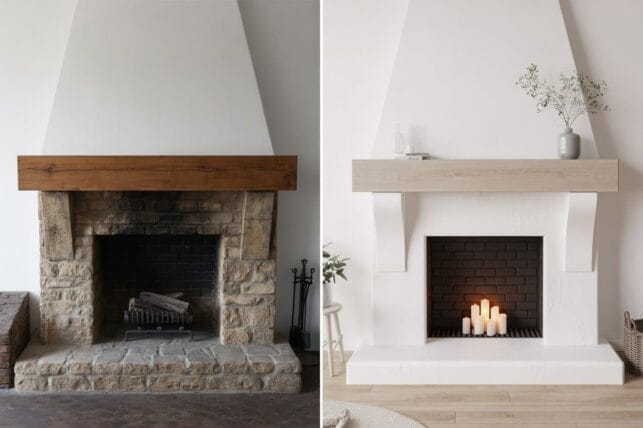 Après : Pierre peinte en blanc mat, manteau remplacé par une poutre en bois clair, accumulation de bougies blanches dans l’âtre. Résultat : lumineux, aéré, style contemporain épuré.