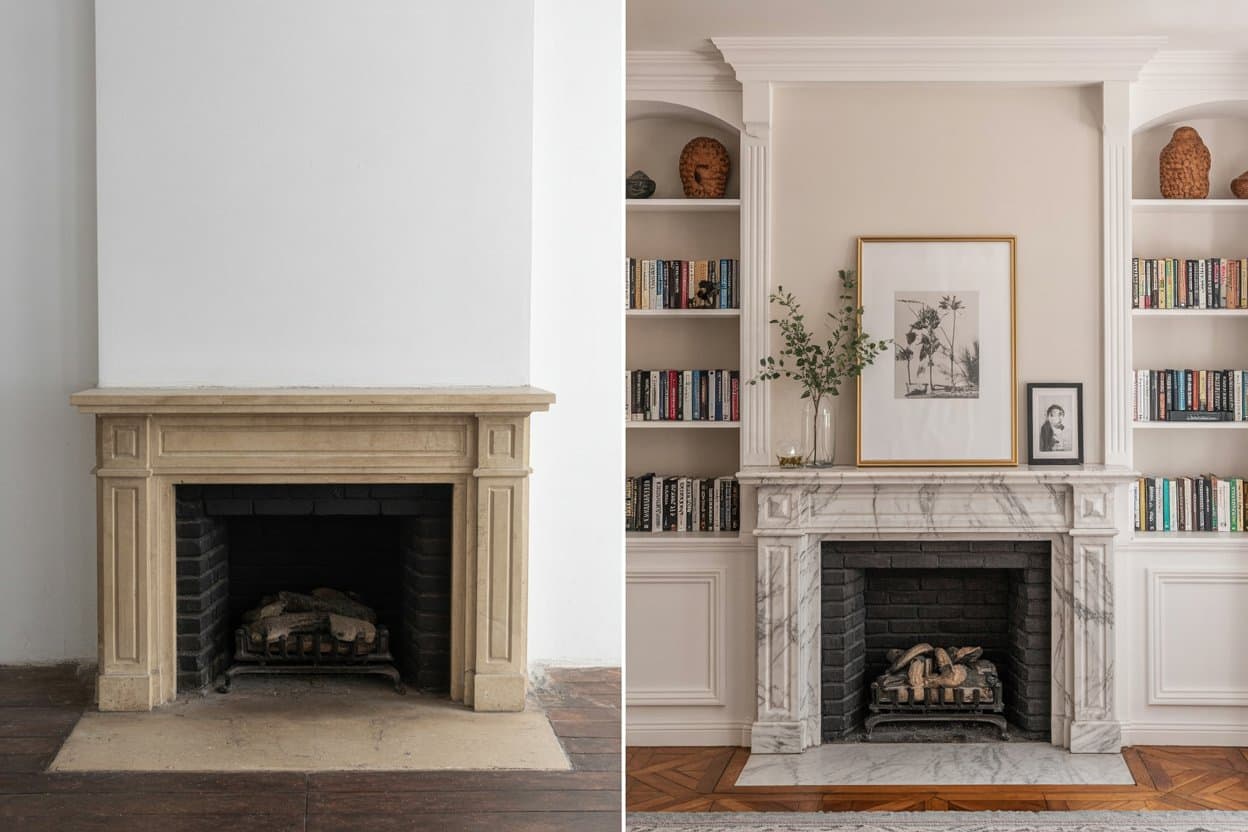 Après : Marbre conservé et nettoyé, étagères intégrées dans le foyer et sur les côtés, livres et décorations de cheminée disposés harmonieusement. Résultat : fonctionnel, personnalisé, espace optimisé.
